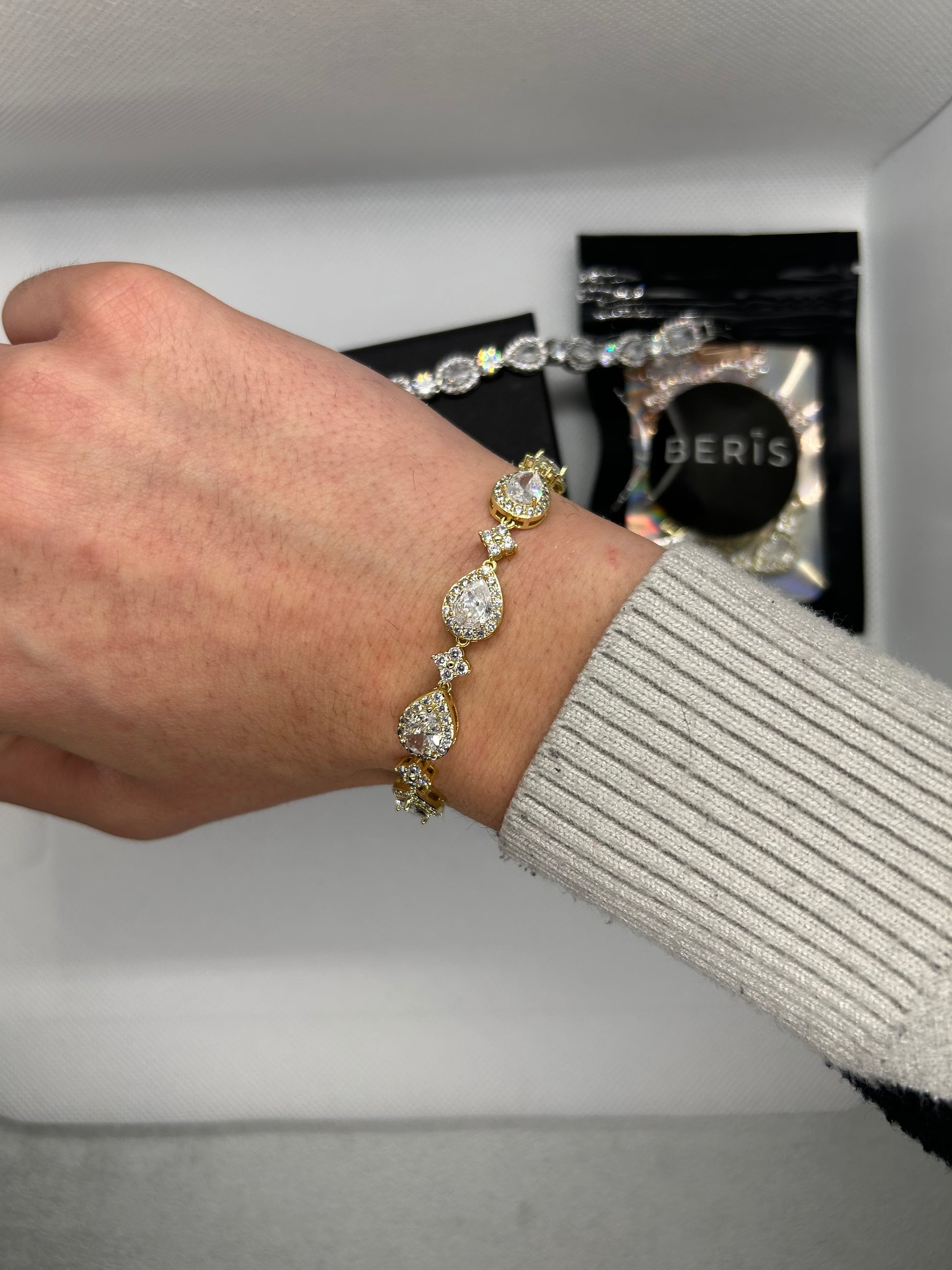 Questo bracciale dorato è un piccolo gioiello che darà luce al tuo polso. Le pietre a forma di goccia brillano tanto, mentre i zirconi aggiungono un tocco speciale. È delicato, elegante e perfetto per farti sentire unica in ogni momento. Un accessorio facile da usare, ma capace di fare la differenza.